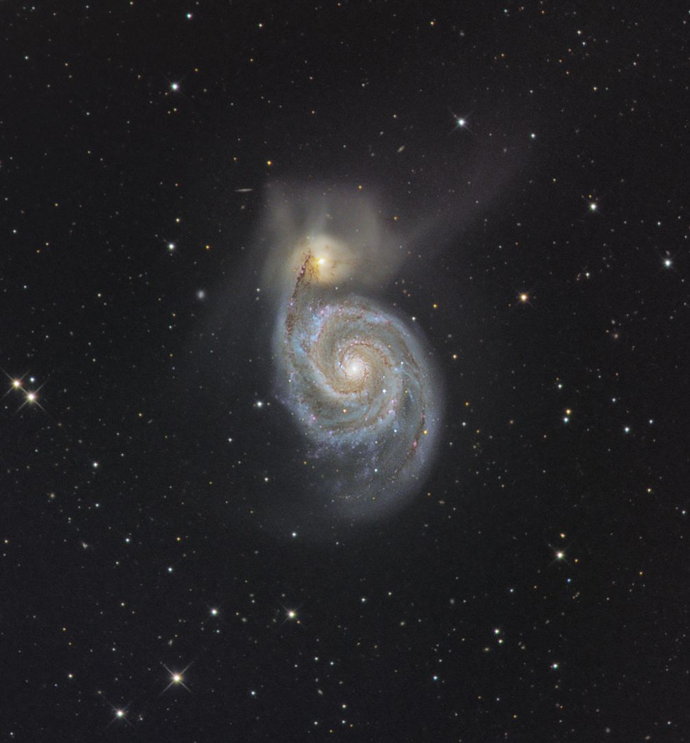 Auf obigem Bild ist M51, eine Spiralgalaxie mit sehr stark ausgeprägten Spiralarmen im Sternbild Jagdhunde, zu sehen. Ihre Entfernung zur Erde beträgt ca. 27 Millionen Lichtjahre. M51 ist auch deswegen interessant, weil es eine der nächsten Galaxien mit aktivem galaktischem Kern ist. In ihrem Zentrum verbirgt sich ein supermassives schwarzes Loch.